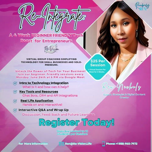 Join us for “Re-Integrate,” a 4-week virtual group coaching session designed to simplify technology for small businesses and solo-preneurs. This beginner-friendly program will help you unlock the power of technology for your business. Each session is interactive and hands-on, ensuring you gain practical skills and valuable insights.